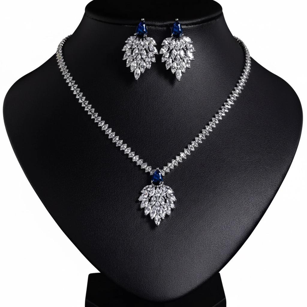 The Midnight Aurora Necklace & Earring Set embodies radiant luxury and refined craftsmanship. Designed with a stream of brilliant-cut stones, the necklace highlights a teardrop sapphire centerpiece adorned with a cluster of shimmering diamonds. The matching earrings mirror the same captivating design — perfect for special occasions or evening glamour.